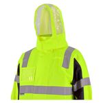 • Concealed hood inside collar, hood has clear panel for extra visibility